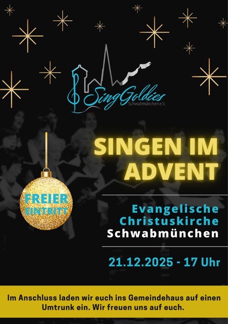 Die SingGoldies laden herzlich zum Weihnachtskonzert in der Christuskirche Schwabmünchen ein. Im Anschluss freuen wir uns, euch im Gemeindehaus auf einen Umtrunk zu treffen.